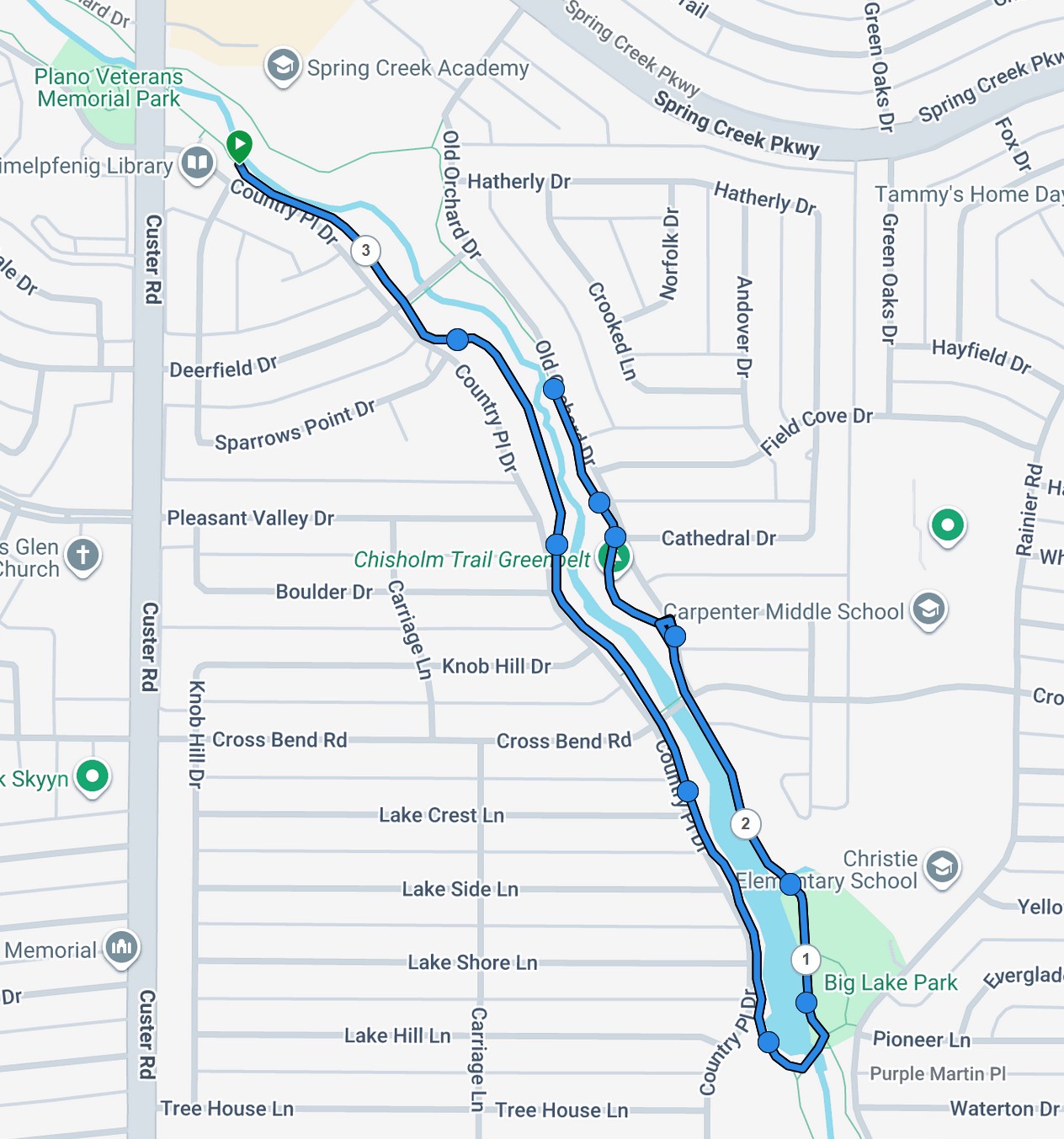 Our Tuesday night Prediction 5K Runs are held on Plano's Chisholm trail starting at Schimelpfenig Library located at 5024 Custer Rd, Plano.  Chisholm trail is a cement sidewalk that runs on either side of Spring Creek. We register in the library parking lot.  Click on the thumbnails below to see a full- sized version of the courses. Due to flooding and path closures we started running an out and back course in 2026.
